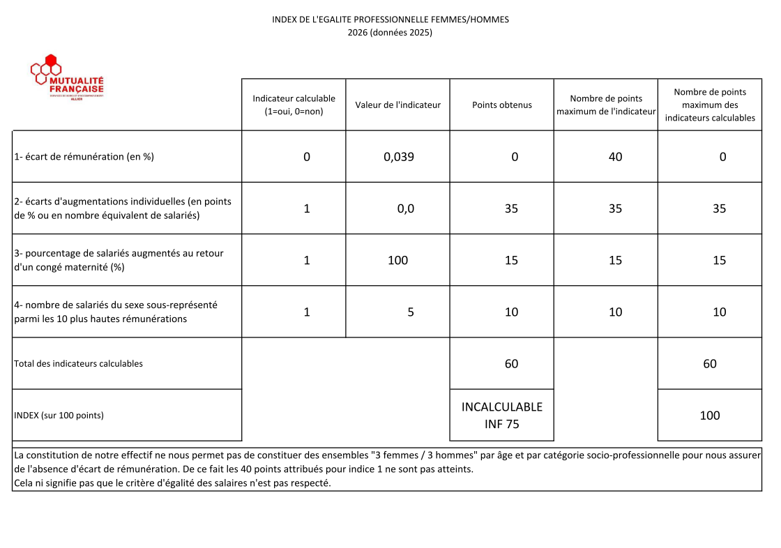 Publication indicateur égalité hommes/femmes 2026 MUTUALITE FRANCAISE ALLIER SSAM Voir la fiche structure
